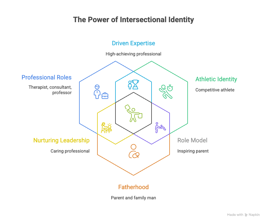One of my best friends who works in marketing once told me that your identity is your brand – few people in my case are male therapists, consultants, professors who also identify as a competitive athlete and who now also identify with being a father – that’s a venn diagram of me and could resonate with many (maybe even you):
