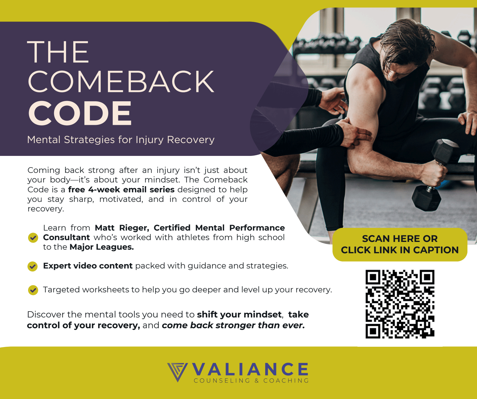 In January of 2025 I built a 4 week course with Matt Rieger to help athletes bounce back from injury. It was a totally free 4 week course called The Comeback Code.